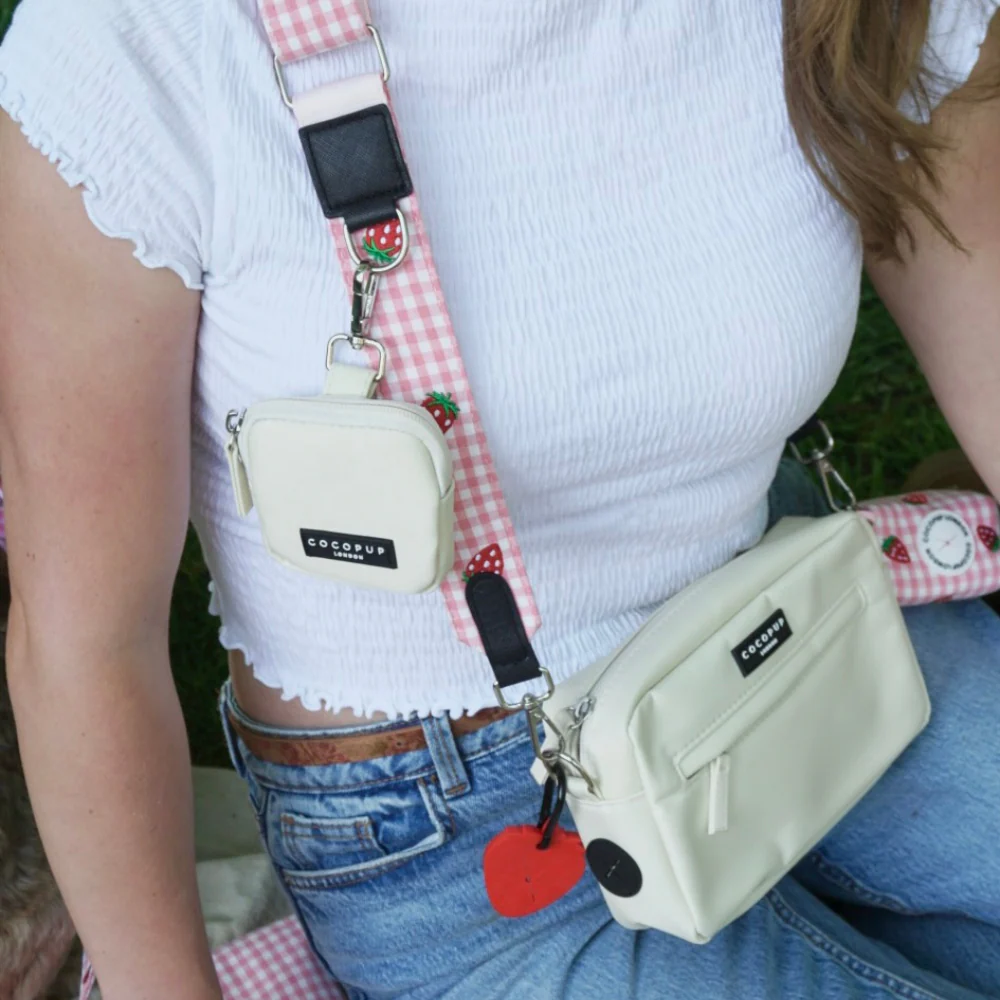 Get ready for summer walks with the Strawberry Picnic Pup bag strap. This playful pink and white gingham strap features embroidered strawberries, making it the perfect accessory for any dog walk. Berry cute and perfect for summer adventures!