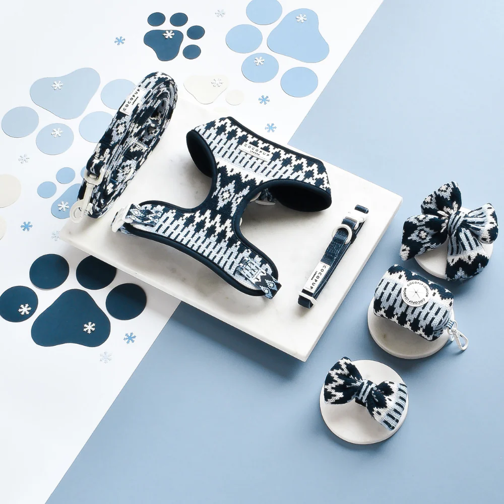 Take your furry friend on the ultimate winter stroll with the Chalet Pup Adjustable Neck Harness. This knitted style blue harness features a charming fair isle design, perfect for keeping your pup stylish and cosy on your dog walks. Enjoy the season with your pup in style!