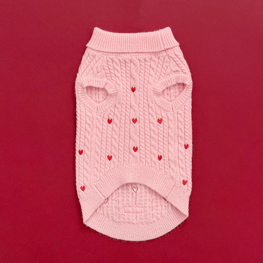 Crafted from a soft, stretchy knit, this jumper features embroidered cute hearts and a traditional cable pattern that adds a touch of heritage style to your dog’s winter wardrobe. Whether you're heading out for a crisp morning walk or snuggling up indoors, this jumper provides extra warmth for your pup.